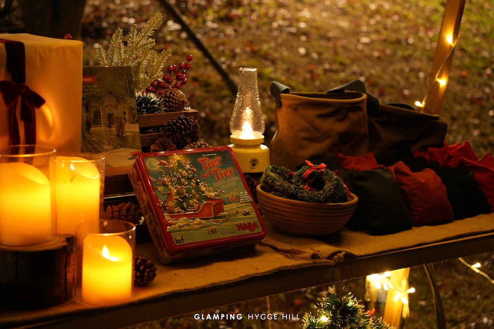 Glamping Hygge Hill 山野森活為每一位旅客,準備了「 聖誕禮物所 」 的驚喜環節,於晚宴時管家會送上 「 聖誕禮物兌換卷 」,用餐後可以持卷到 戶外Hygge Bar,從可愛的聖誕襪中抽取一份專屬的聖誕禮物!這份驚喜充滿山野森活的特色與心意,包含:日本插畫家合作品牌帆布包、山野森活限定品牌鋼杯、小鹿別針、安睡枕頭噴霧、舒壓刮痧板、特色藺草小鹿、森林沐浴包等,將這份 Hygge 暖意延續到您的日常生活中。