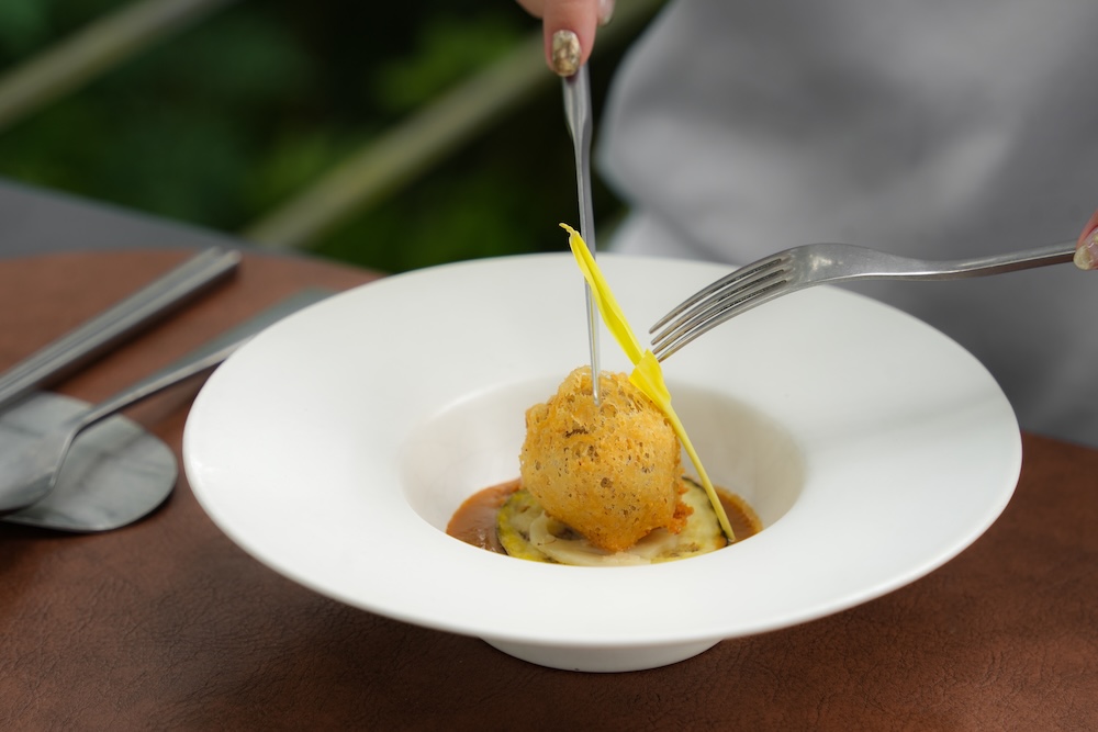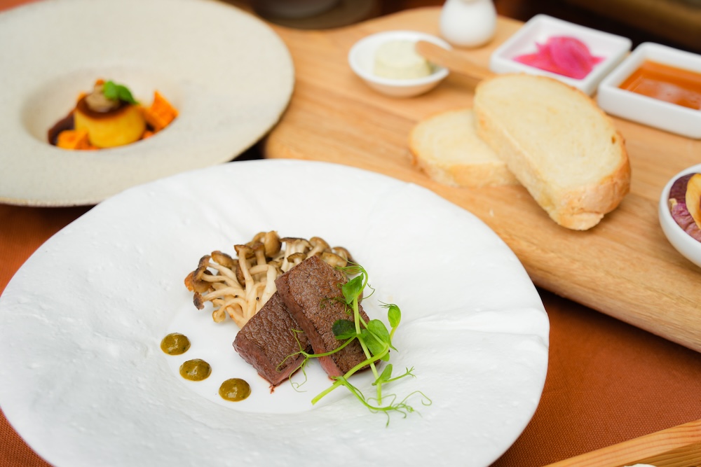 奢華的A5和牛以高溫煎封,外香脆、內多汁,佐以牛油碳烤舞菇,香氣濃烈而有野性氣息,與牛肉的鮮甜相互輝映。搭配以九層塔為基底的台式青醬,帶來草本的清新氣息,將秋山林的豪邁氣息展現無遺。